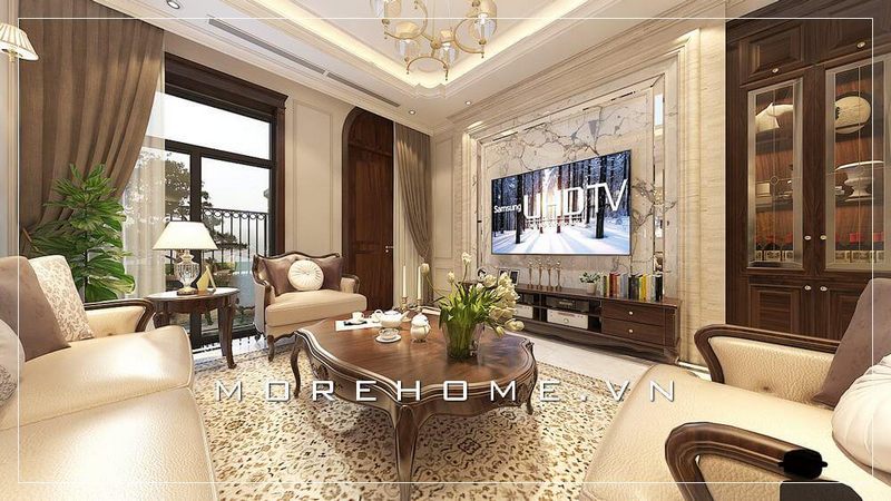 Bố trí nội thất phòng khách tân cổ điển đẹp, sang trọng tại Vinhomes Imperia Hải Phòng.