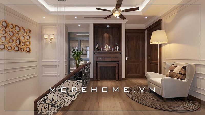 Mẫu bàn thờ đẹp biệt thự được đặt ở vị trí tầng 2, KTS đã khéo kéo thiết kế tường âm để tạo không gian riêng tư để bàn thờ với tường ốp gỗ mang đến vẻ đẹp sang trọng và cao cấp