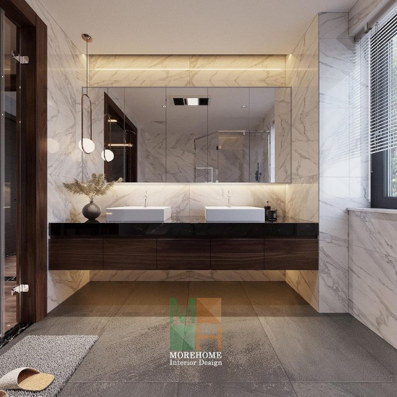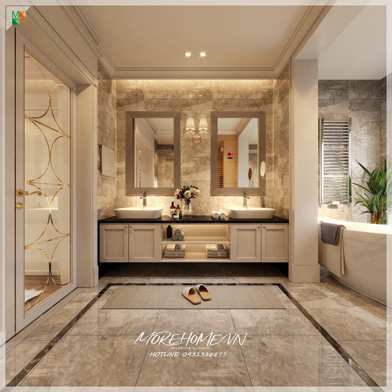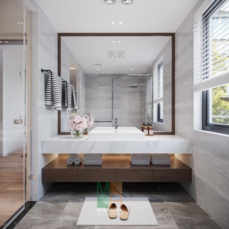 Nội thất phòng tắm biệt thự sang trọng, sạch sẽ. Các vật liệu nhẹ như kính cường lực, gương, hay đơn giản là các chi tiết mở rộng như thiết kế kết hợp tủ và kệ giúp tiết kiệm đáng kể diện tích sử dụng