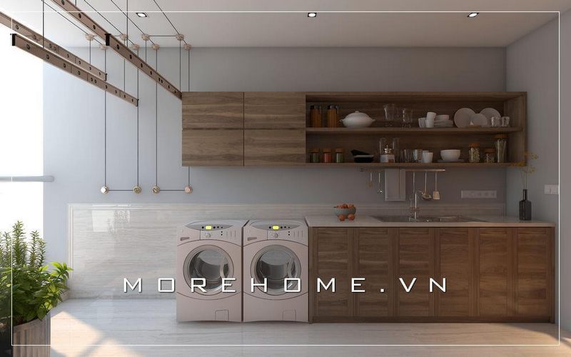 Mẫu tủ bếp gỗ công nghiệp kiểu hiện đại có thiết kế chia ngăn kiểu đa dạng thuận tiện lưu trữ đồ đạc