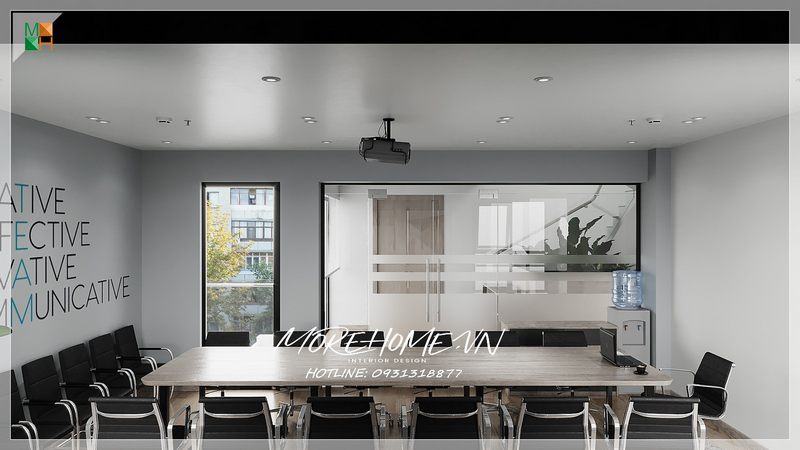 Phòng họp văn phòng công ty VCC được thiết kế hiện đại đẹp với đồ nội thất văn phòng đơn giản, tiện lợi với tông màu chủ đạo trắng vàng với sức chứ hơn 60 người.