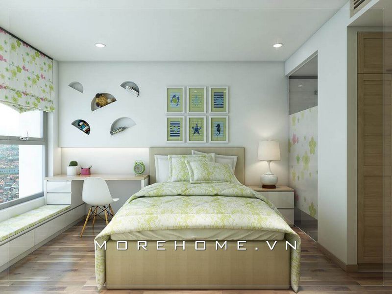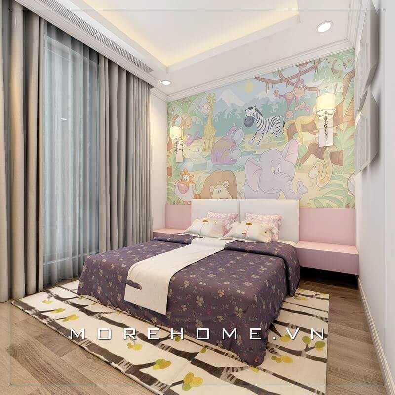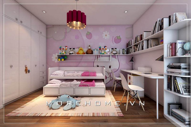 Phòng ngủ con được thiết kế hài hòa, tông màu trắng là tông màu chủ đạo của căn phòng.