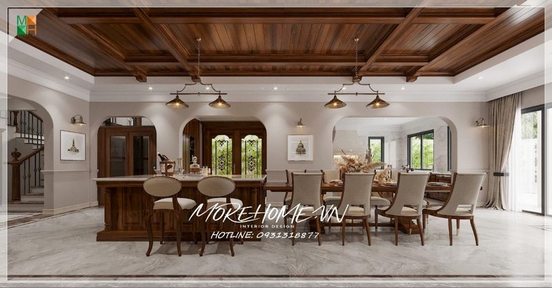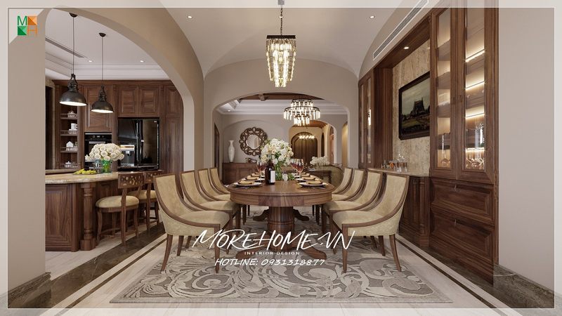 Thiết kế phòng ăn mở rộng rãi với bộ bàn ăn kèm 8 ghế ăn và 2 ghế bar tân cổ điển gỗ óc chó sang trọng cho những buổi tụ họp liên hoan gia đình