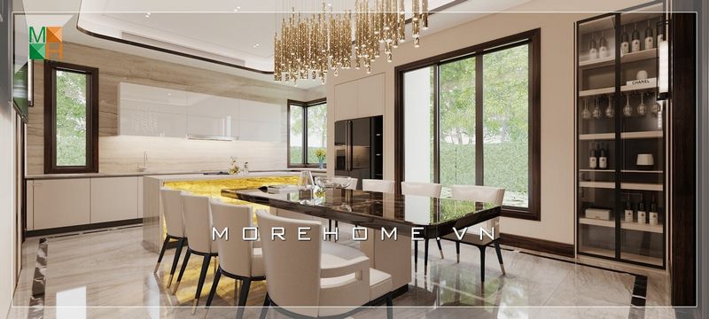 Thiết kế không gian phòng ăn biệt thự hết sức sáng tạo và rộng rãi đón ánh sáng tự nhiên qua khung cửa sổ rộng lớn.Sử dụng mẫu đèn chùm cao cấp cũng là một điểm nhấn của căn phòng ăn. Tất cả tạo nên một không gian phòng ăn cao cấp, sang trọng và hiện đại pha phút tân cổ điển.
