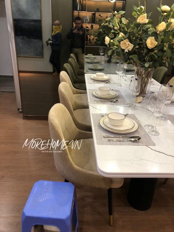 Cận cảnh sản phẩm bàn ăn mặt đá nhân tạo vân mây trắng kèm 6 ghế chân sắt bọc nệm nỉ màu be kiểu dáng nhỏ gọn hiện đại cho phòng ăn chung cư do Morehome thi công