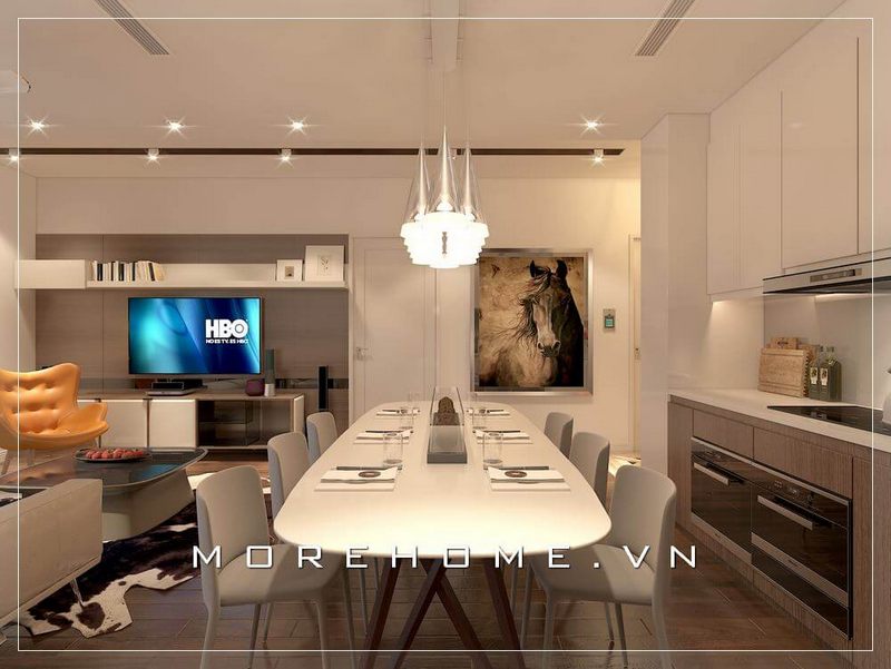 Thiết kế nội thất phòng ăn chung cư liền kề với các không gian sinh hoạt chung khác giúp cho gia chủ dễ dàng tiếp đãi khách tới chơi nhà những bữa ăn ngon miệng và nhanh chóng hơn