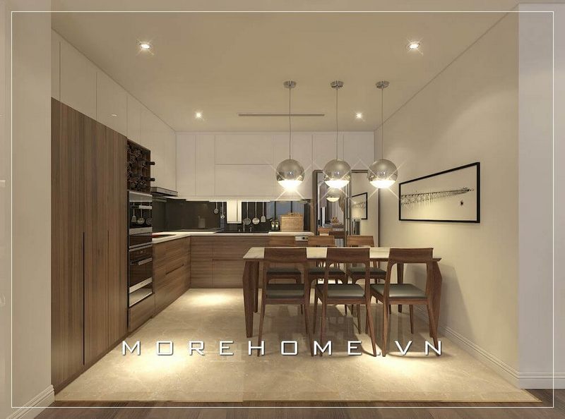 Phong cách thiết kế nội thất bếp hiện đại,màu sắc hài hòa. Thiết kế phòng ăn cũng rất sáng tạo và ấn tượng từ việc lựa chọn tủ bếp hiện đại, bàn ghế đến trang trí các tranh canvas treo tường rất cuốn hút.