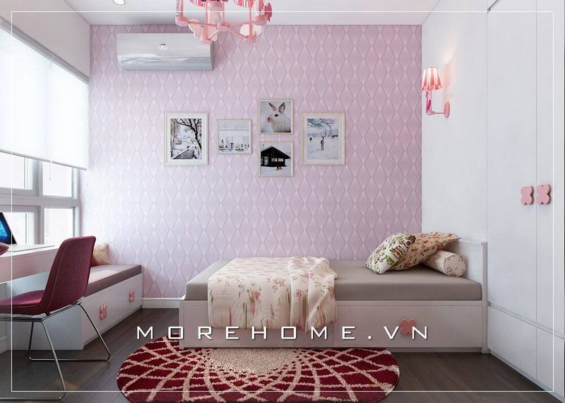 Phòng ngủ bé gái được trang trí đẹp mắt bằng giấy dán tường họa tiết màu hồng ấn tượng, và chiếc giường ngủ hiện đại tích hợp ngăn kéo phía dưới giúp tạo ra nhiều không gian lưu trữ đồ dùng.