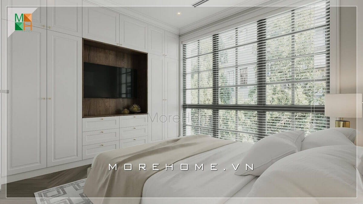 Thiết kế phòng ngủ đơn giản nhưng tiện nghi với hệ thống tủ âm tường hiện đại đem lại cảm giác thoáng đãng và cao cấp cho không gian biệt thự.