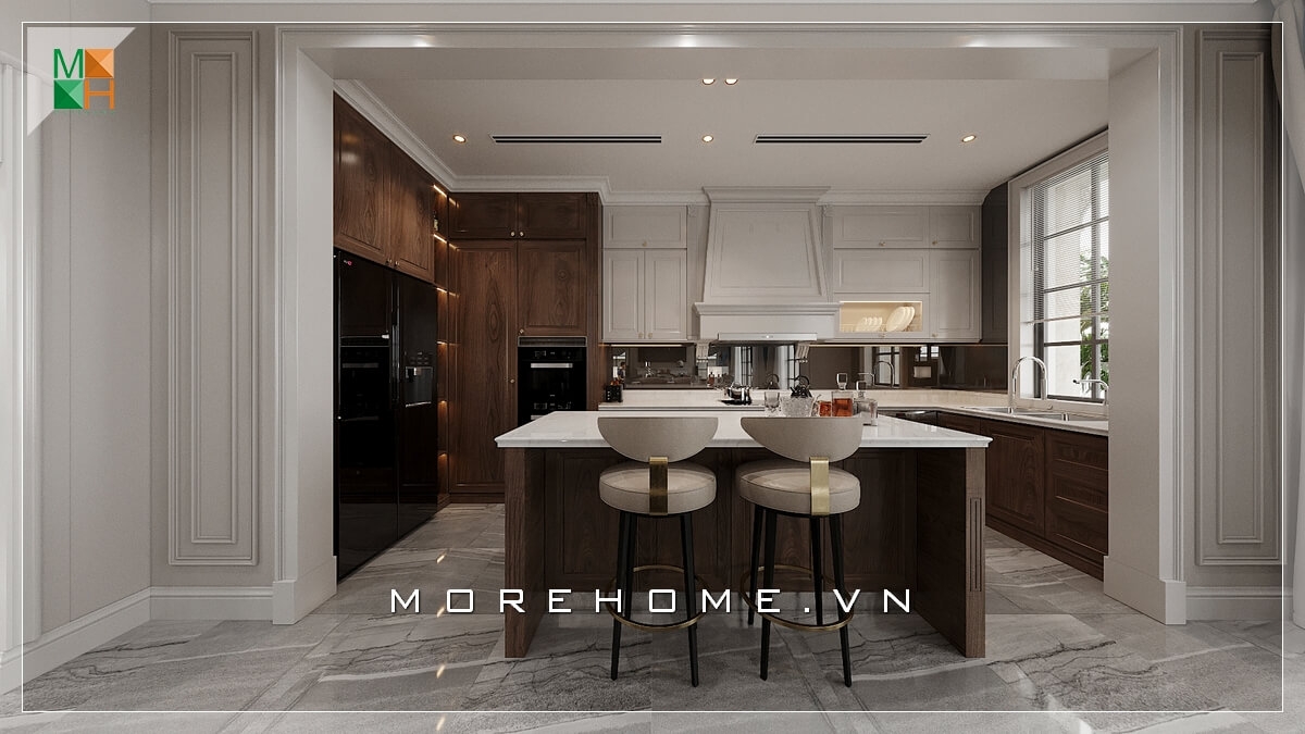 Thiết kế phòng bếp biệt thự với nội thất bố trí hiện đại có bàn đảo nhỏ giúp thuận tiện cho sinh hoạt của gia đình.