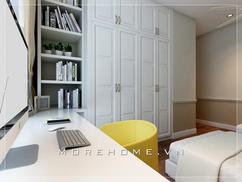 Tủ quần áo gỗ tự nhiên nhập khẩu, màu trắng chủ đạo gợi cho phòng ngủ chung cư nhỏ thêm rộng thoáng và sang trọng